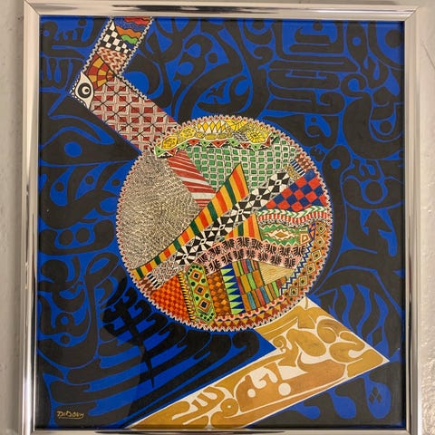 Giza-pyramiderne har jeg malet med Nilen i forgrunden. Jeg forestiller mig, at de kæmpe store byggesten er blevet fragtet op af Nilen. Maleriet måler 80x80cm.