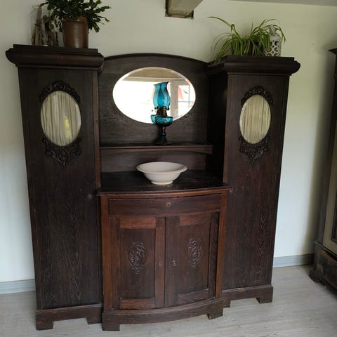 Arbejdet er afsluttet på alle sider. Fantastisk til udstilling, også når møblet står ud fra væggen eller midt i rummet. I god stand med kun enkelte brugsmærker.