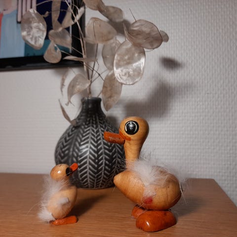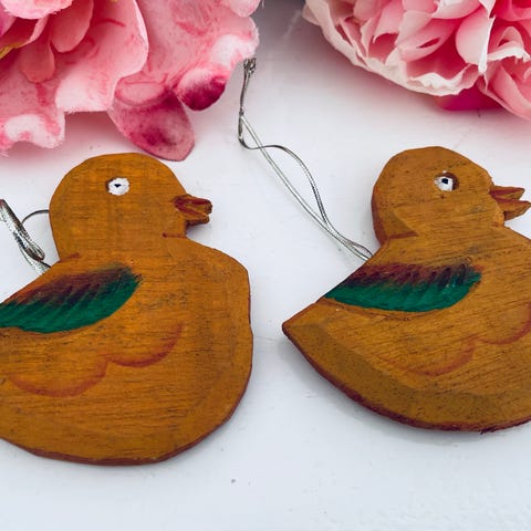 Gl , Gl sjældne træænder m sjælden lille, Ældre Påskepynt fra 70-erne i træ. Træand træælling and ælling m pels