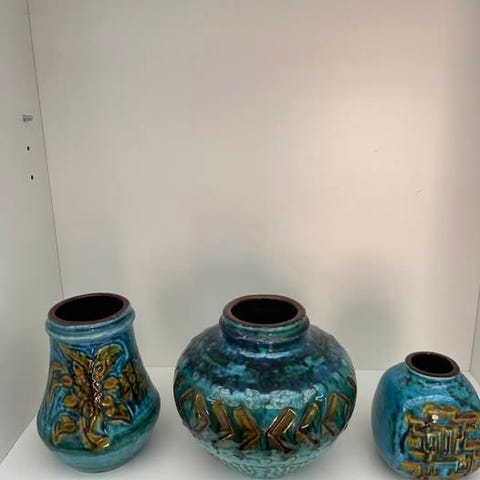 W. Germany vaser, hvoraf 2 er fra Carstens Tönnieshof (muligvis en afstikker af Ankara dekorationen). Højeste vase måler 26cm. Kun den med rød dekoration er tilbage, de 2 andre er solgt. Den røde koster 249 kr.