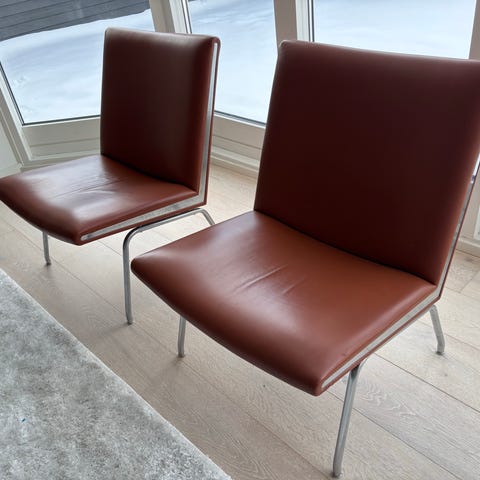 Hans J. Wegner Lufthavnsstol model AP 38, ombetrukket. ÉN i nyt SORT læder, ÉN i CREME læder, aldrig taget i brug herefter, så der er ingen slidmærker.