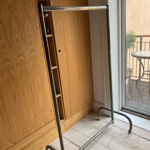 Solidt og stiligt tøjstativ til bøjleophæng, samt en glasplade så hylden kan bruges til opbevaring eller udstilling.