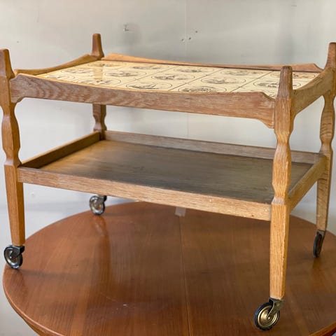 Rullebord, Henry Kjærnulf, 1 stk super flot brugt Kjærnulf rullebord med kakler, rullebordet er i massiv egetræ og selvfølgelig med 4 hjul under, bordet er i god stand. L:82cm. D:52cm. H:66cm. Prisen for rullebordet er kun 375kr.