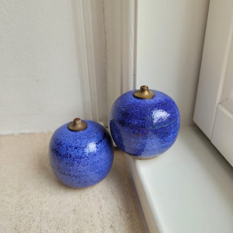 Olielampe af ukendt keramiker, nok ca. 1990'erne. organisk/svampeform, 2 huller i uens størrelse. Kombination af lilla/beige glasurer. Umærket.