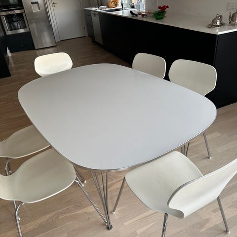 2 stk brugte spisebordsstole Erik Jørgensen Eyes, designet af Johannes Foersom og Peter Hjorth Lorentzen, stole trænger til en grundig rens, da der er spildt kaffe og lignende, deraf prisen. Stole har brugsspor. B:50cm. D:44cm. H:83cm. SH:45cm. Stole er ikke nye og sælges derfor som brugte, derfor kan der forekomme ridser, slid og skrammer. Prisen er kun 550kr samlet.
