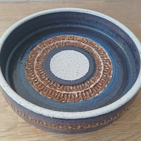 Keramik, Lille, rundt fad, brunt/mørkeblåt/gråt, Kingo Keramik, 3,2 cm højt, 17,2 cm i diameter.