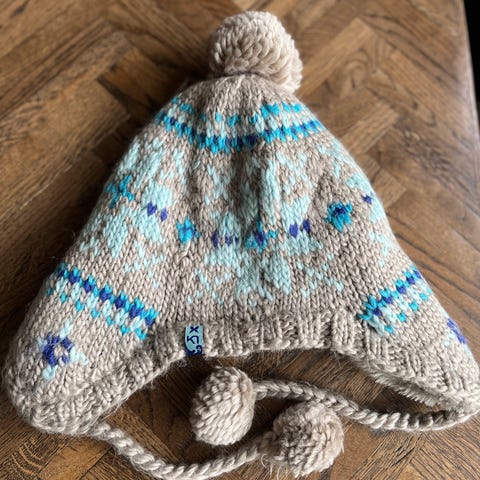 Fin hvid strikhue, tophue med kvast og snoninger fra Kari Traa str. oz.