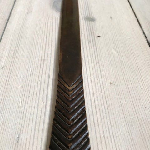 Brevkniv med håndtag i tin designet af Just Andersen. Håndtag med mønstre nær blad. Pudsigt nok uden nummer, som Just Andersen-ting ellers har, blot mærket på siden af håndtag med logo og "Danmark", samt lille pudsigt mærke på ene side af blad: Spiral med 5 ben.