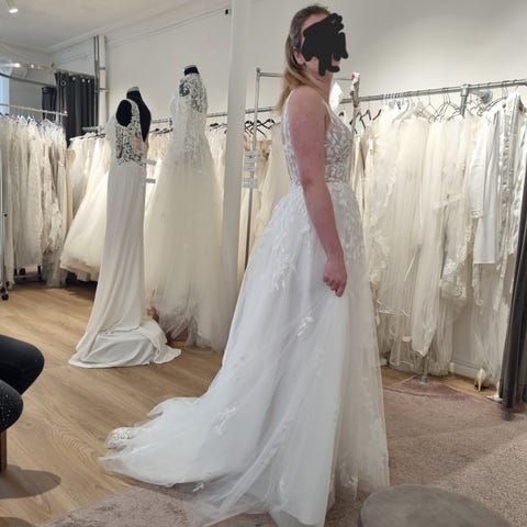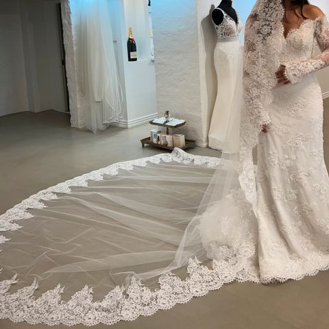 Denne flotte brudekjole var skræddersyet til min specielle dag, men jeg fik aldrig chancen for at have den på. Den er som ny, kun prøvet på. Kjolen er fra 2024 kollektion og lavet med fantastisk kvalitetetsmateriale for at sikre en luksuriøs følelse på din bryllupsdag. Den er fyldt med perler og glimmer der skinner langs kjolen, både på ærmerne, kjolelivet og skørtet. Den er høj i kraven som man kan se på billedet, og også dækket bagpå, så den er perfekt hvis man ikke bryder sig om at vise for meget hud.