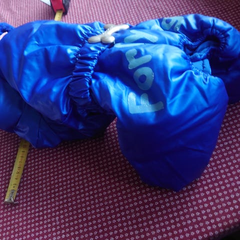 For my Dogs flyverdragt str 16 (ryglængde 33cm) til hun hund, kan godt passe til hunde med ryglængde fra 31-34 cm. Har selv anvendt den flittigt i skov og by til en dværg Puddel med ryglængde 31,5. Der er ingen markante brugsspor, altså ingen rifter, huller, slidt lynlås eller møre elasikker, men der er lidt slidt stof hved bunden af benene da jeg prøvede om den kunne bruges af min anden Toy Puddel dog var den for lang i benene så hun gik og snublede i den, se de sidste 3 billeder.