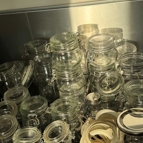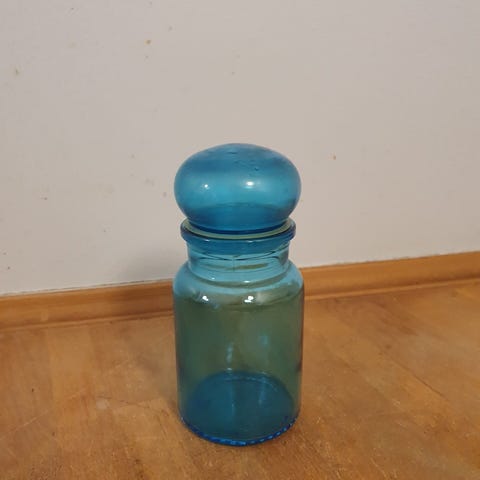 Olivengrøn farvet glas til opbevarings med koboltblå låg af glas.