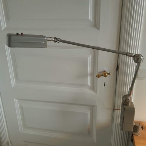 Gammel retro bordlampe, arkitektlampe , patineret. Ca. 70cm, sort. Vil tro den er fra 40’erne. Virker. Kan sendes.