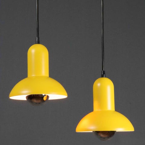 Anden arkitekt, Klokkeblomstpendler, 2. stk. Aluminium pendler fra 70érne, monteret med originale blænd skærme, porcelænsfatninger og henholdsvis 2 og 2,5 meter sort stofledning i meget fin stand. Diameter: 14,5 Højde med pære 16 cm. Prisen er for sættet.