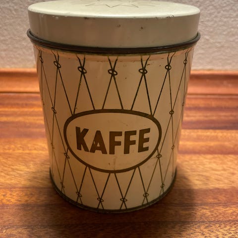 Kaffedåse i flot grøn metal med patent-lukning så kaffen holder sig frisk.