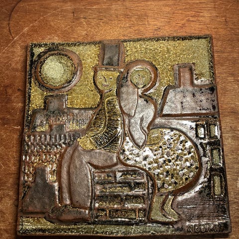 Stort stentøjsrelief til ophæng fra danske Søholm, designet af Noomi Backhausen. Motiv af hanehoved (tror jeg nok) i matte lysebrune/mørkebrune glasurer og klare brune/højrøde glasurer. Mærket foran i bund med "Noomi" og bagpå med Søholm-logo, nummer og "K".