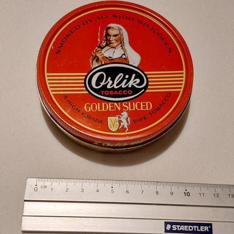 Metalæske til tobak. Brugt men i god stand. Afgiftsmærke i bunden. 3 stykker er vist, men der er kun 2 tilbage.