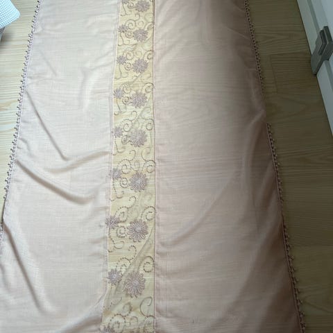 Længde med frynser er 2 m og bredde er 47 cm