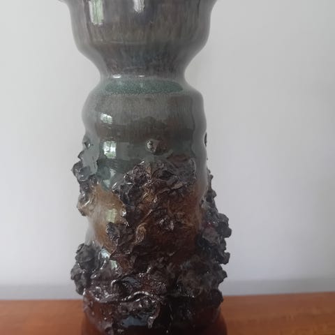 Fin lille vase med lava-stykker påsat langs siden. Blank, sort glasur på hals/top med flot overgang til mørkeblå på overdel af siden,hvor der igen afløses med sort fra lavastykkerne og ned. Mærket med GLIT-logo i bunden og originalt klistermærke på siden: "Handmade Icelandic Lava".