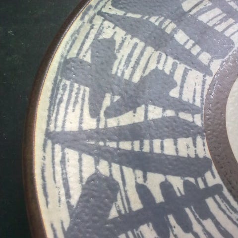 Meget nydeligt fad designet af Vicke Lindstrand, der designede for Upsala Ekeby AB i perioden 1942-1950. De brede riller er meget lang kant/sider og forsvinder mod bund, der er helt glat. Mærket under bund med "Ekeby", "221" og "V.L.".