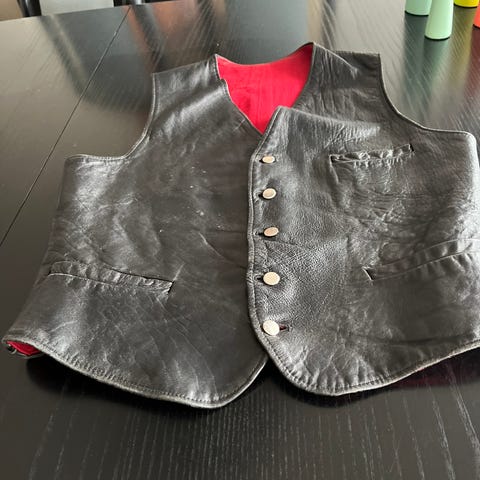 Jeg sælger en fed og nykøbt vintage skindvest i medium. Fed bikervest med lædersnøre i siderne, så man kan indstille vesten efter behov.