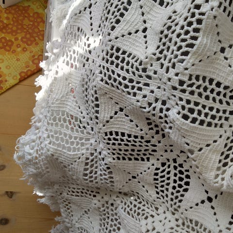 Tæppet er hæklet i kunstgarn og kan derfor maskinvaskes.