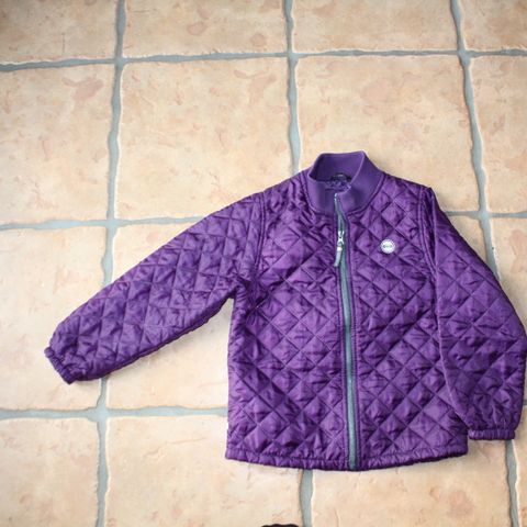 fin bordeaux termojakke fra Steenholt i str. 116. Den har elastik ved ærmerne og en refleks i bunden på ryggen.
