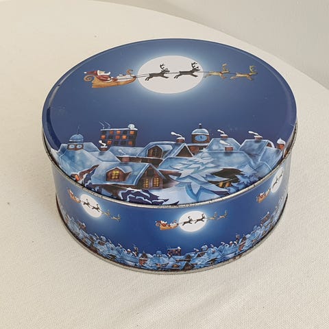 Flot blikdåse i farverne grå og guld, og med et vinter eller julemotiv på låget.
