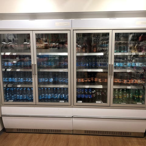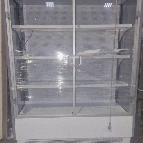 Denne reol er uden døre, velegnet til kunder selv kan tage vare. Men har gardin i top til at kører ned om natten.
