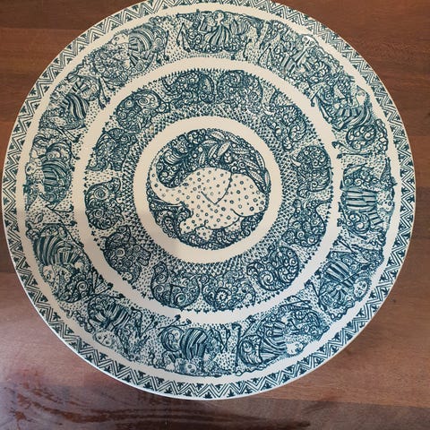 Diameter ca 22 cm. Har nogle få afskalninger- se billeder, ikke noget man umiddelbart bemærker