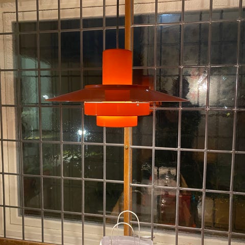 Anden arkitekt, Falcon, pendel, Fin pendel designet af Andreas Hansen i 1969 i Falcon serien for Fog & Mørup. Farverne er orange og rødbrun. Denne pendel giver et godt lys op af skærmene, så rummet også lyses op. Diameter er 40 cm og højden er 22 cm. Jeg har flere modeller af denne pendel i flere farver. Prisen er 2.500 - 3.500 kr. pr. stk.