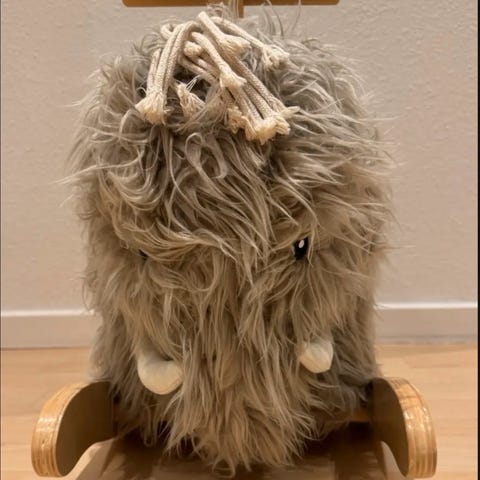 Gyngeæsel i fin stand, lille “revne” i den ene ben, men fungerer udmærket. Smuk, blød og sjov tilføjelse til børneværelset.