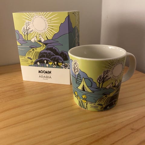 På kruset ser man Mumitrolden og Snorkfrøken lege nede ved en å. Solen skinner og blomsterne er udsprunget. Mumrikken er netop vendt tilbage fra sin vinterrejse, og han står med armene i vejret og kigger på himlen. Motivet har en gulgrøn baggrund.