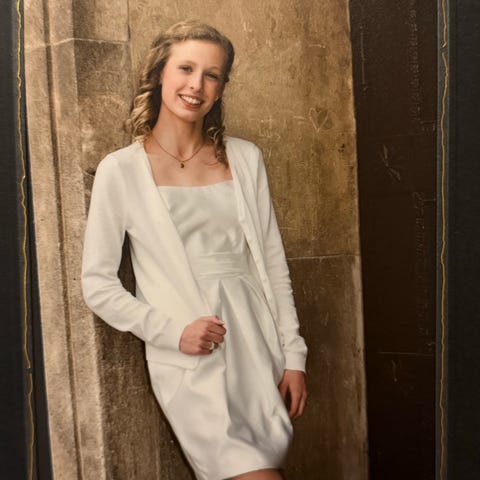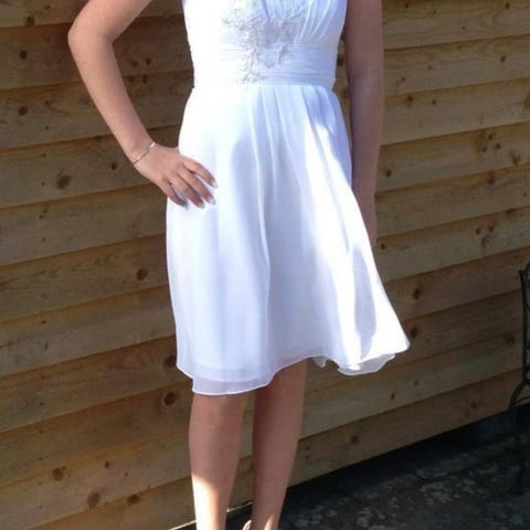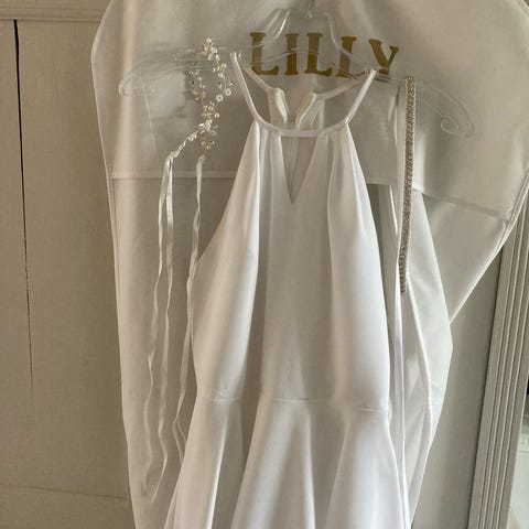Smuk lang kjole som kun er brugt en gang. Der medfølger en kortærmet blonde bolero som kan bindes foran, hvis man synes at kjolen er lidt bar foroven. Kjolen er ikke vasket/renset, og på sidste billede kan ses små brugstegn som ikke er forsøgt fjernet.