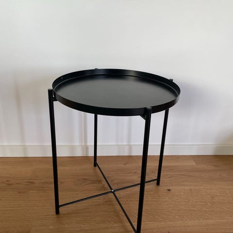 Enkelt sort bakkebord fra ikea. 45 cm i diameter. Små overfladiske brugsspor. Fra ikke -ryger hjem. Perfekt til ungdomsværelse.