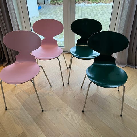 2 brugte originale myrestole fra 60'erne, de 3 benede, ret slidte, oprindelig træ, men nu hvidmalede, 300kr pr stk el begge for 500kr, de er fine i ryggen, kom glad🤍🤍🤍 #ajstole #arnejacobsen #original #myrestole #danishdesign #60's