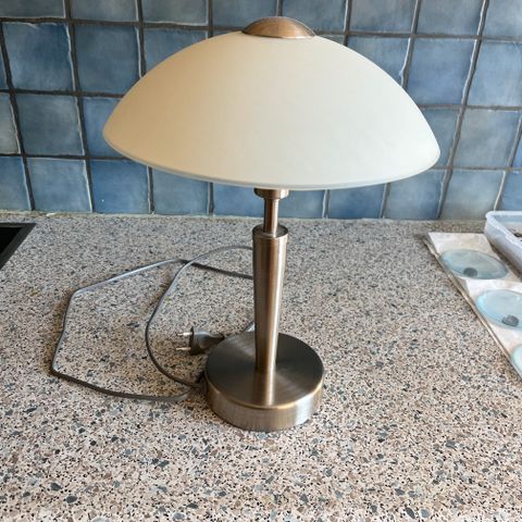 Bordlampe med indbygget dimmer funktion. Højde 58 cm. Omkreds på fod er 20 cm. Skærm i materet hvidt glas. Finish på fod og arm er chrome.