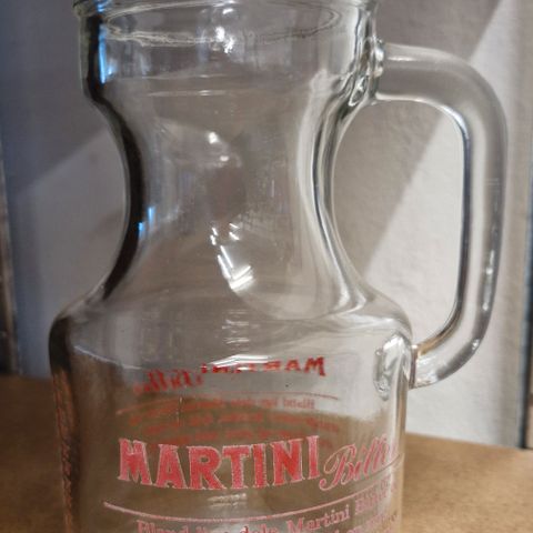 2 høje ( rummer ca 2 dl champagne glas) og en kande( rummer ca 1/2 L) alle tre har Martini logo. Kanden har forskelligt skrift på siderne 1 normal og en dry martini vermouth. Kanden har desuden en lille “guld kant” ingen har, revner eller lign. Alm brugs spor, det er ikke afslag eller andet på kanden det er en luft bobbel. H på kanden ca 15 cm, dia ca 9 cm inkl tud, h glas ca 22 cm, dia ca 5 cm. Har selv haft det stående i hjemme baren.