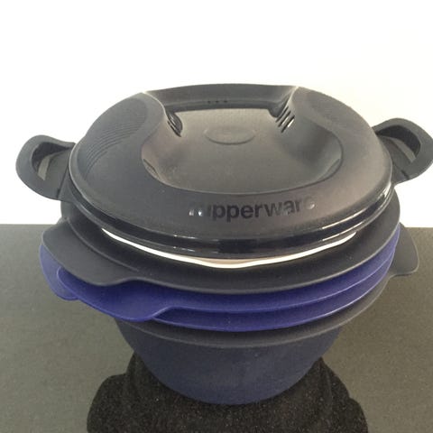 Tupperware damper til microovn. Består af fire dele - underskål til vand, stor skål til eksempelvis grøntsager, flad skål til eksempelvis fisk samt låg. Aldrig brugt.