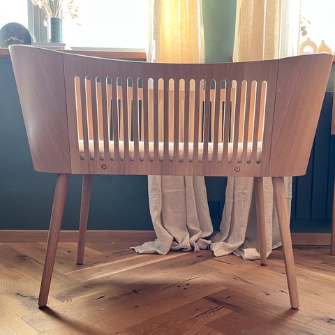 Den er utrolig nem at slå sammen, så den ikke fylder så meget. Siden kan nemt åbnes, så der er nem adgang fra sengen. Og den kan selvfølgelig indstilles i højden, så den kan tilpasses den enkelte seng.