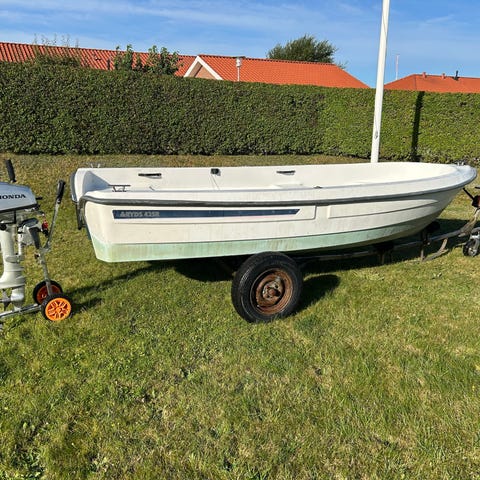 Båden står på trailer i en lade i Regstrup. Den er tom inden i- motor er der stadigvæk. Den har stået i lade og tørt siden den blev taget op