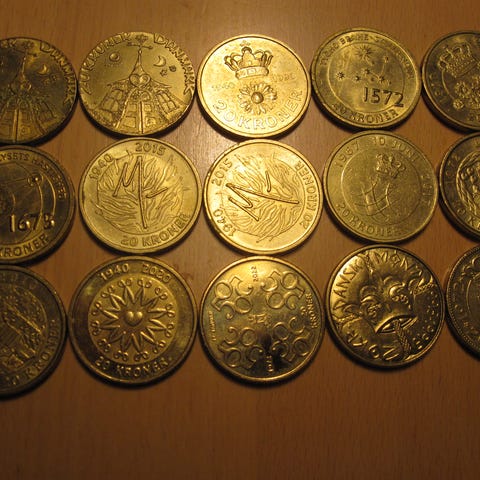 Danmark, mønter, 20 KR, 13 FORSKELLIGE DANMARK 20 KR. TEMA MØNTER