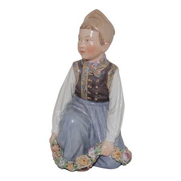Porcelænsfigur af Amagerdreng Teknik : Overglasur. Kgl. figur fra Royal Copenhagen 12414 Dreng med blomster guirlande i egnsdragt fra Amager 15 cm af Carl Martin-Hansen (1877-1941) yderst sjælden uden afslag.