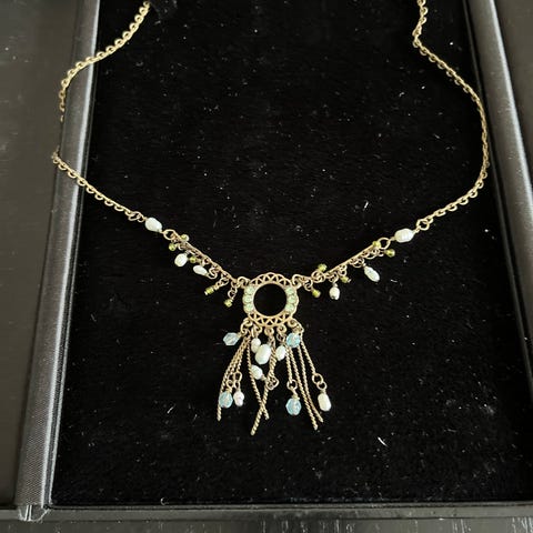 Halskæde, Stofsnor med lyserøde sten og sølvfarvet blomst.