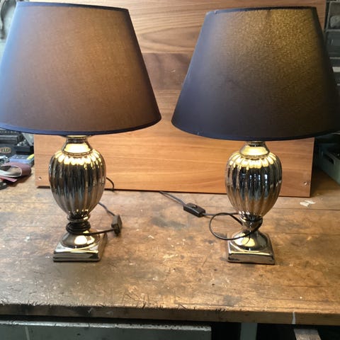 4 stk bordlamper med skærme. Pr stk kr 75, samlet alle 4 kr 250.