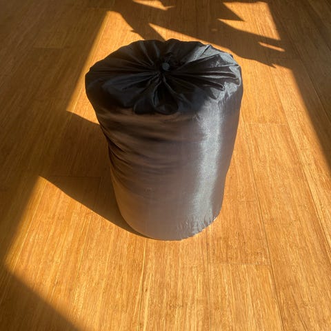 Tension Junior everes med pakpose og opbevaringspose. Sidstnævnte bør absolut anvendes, når posen ikke er på tur, så dunene bevarer den spændstighed, der er hemmeligheden bag isoleringsevnen.