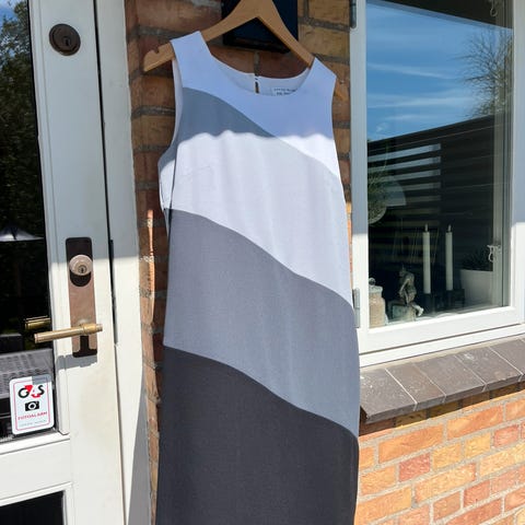 Sort kjole med hvidt mønster og små slidser i siderne fra Jacqueline de Young i str. large, kvaliteten er polyester, dobbelt lag stof og lynlås i ryggen, pæn og velholdt.