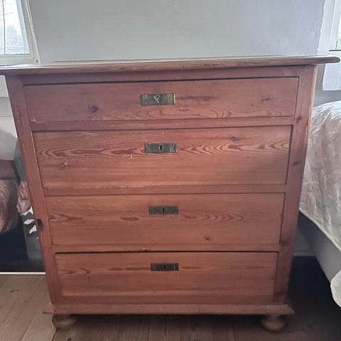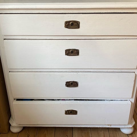 Der er få slitagestød når man er så hammel. Men det er en super gefigen kommode. Med skuffer der fylder det hele! Det ene beslag er ikke påsat, men det findes.