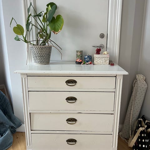 Der er få slitagestød når man er så gammel. Men det er en super gedigen kommode. Med skuffer der fylder det hele! Det ene beslag er ikke påsat, men det findes.
