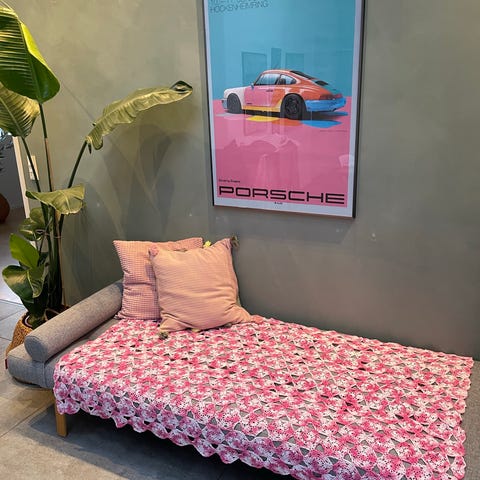 Håndlavet hæklet tæppe fremstillet i bomuld m.m. med et farverigt mønster bestående af firkantede motiver i forskellige farver. Tæppet måler cirka 120x180 cm og har en sort kant med blå detaljer. Velegnet til brug som dekorativt tæppe eller som et varmt tæppe til hjemmet.