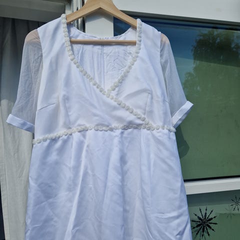 Min fine brudekjole trænger til en ny brud og kommende mor. Den er luftig og kan bruges af størrelserne M-L uden problemer. Jeg var 7 måneder henne, da vi blev gift, så den kan sagtens rumme en større mave. Den er i to lag og underkjolen kan derfor let skiftes ud med f.eks. en anden farve. Den går til knæet (jeg er 1.68) og der medfølger hvidt bånd til maven og bolero fra Lily str. 40